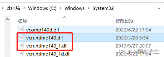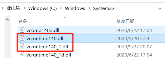在 C:\Windows\System32 文件夹中找到 vcruntime140.dll 以及 vcruntime140_1.dll: