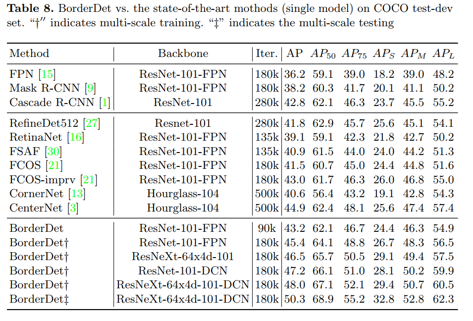 使用FCOS做为baseline的BorderDet性能如下表所示: