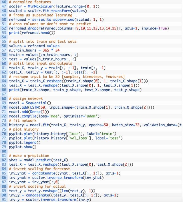 接下来,所有特征都被归一化,然后数据集转换成监督学习问题。之后,删除要预测的时刻(t)的天气变量。