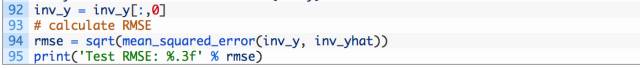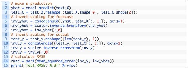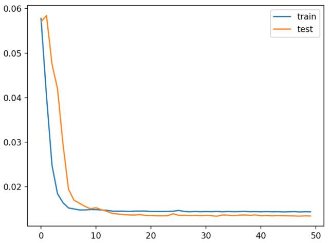 在每个训练 epoch 结束时输出训练和测试的损失。在运行结束后,输出该模型对测试数据集的最终 RMSE。我们可以看到,该模型取得了不错的 RMSE——3.836,这显著低于用持久模型(persistence model)得到的 RMSE(30)。
