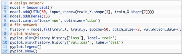我们将在第一个隐藏层中定义具有 50 个神经元的 LSTM,在输出层中定义 1 个用于预测污染的神经元。输入数据维度将是 1 个具有 8 个特征的时间步长。
