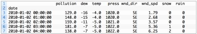 运行该例子打印转换后的数据集的前 5 行,并将转换后的数据集保存到「pollution.csv」。