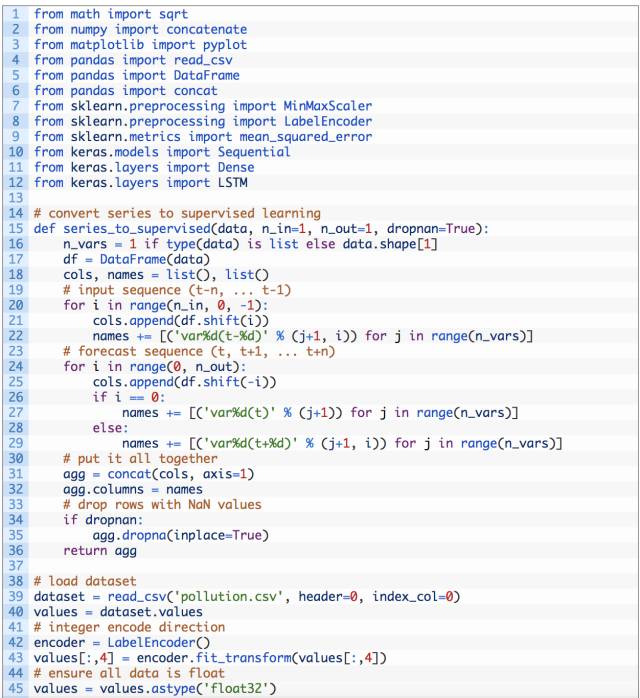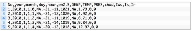 我们可以使用这些数据并构建一个预测问题,我们根据过去几个小时的天气条件和污染状况预测下一个小时的污染状况。此数据集亦可用于构建其他预测问题。