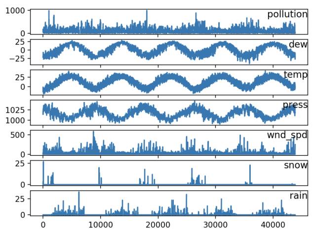 下面的代码加载了「pollution.csv」文件,并且为每个参数(除用于分类的风速以外)绘制了单独的子图。