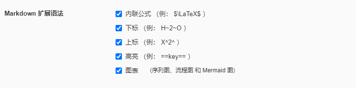 在使用之前,要确保我们的Typora 已经打开 内联函数的开关,具体步骤为 :左上角文件 → \rightarrow→ 偏好设置 → \rightarrow→ Markdown → \rightarrow→ Markdown 扩展语法 → \rightarrow→ 勾选内联公式,如下图:
