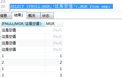SELECT IFNULL(字段名,'这是空值'),字段名 from 表名;