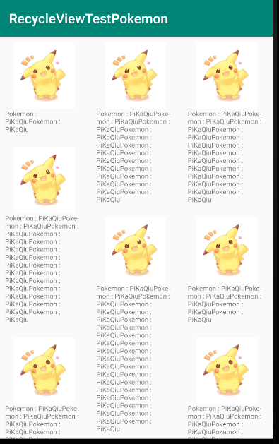 - 在初始化Pokemon数据后,实例化RecyclerView,然后实例化一个布局管理器传入RecyclerView以达到设置RecyclerView布局的效果。本例使用StaggeredGridLayoutManager,和它一样的还有GridLayoutManager、LinearLayoutManager,它们创建一个布局管理器,然后用setLayoutManager将布局管理器传入RecyclerView内实现布局设置。布局管理器还可以详细定制,比如本例中,设置GridLayoutManager为三列,并且垂直分布(不懂看效果图就明白设置为三列什么意思了)。