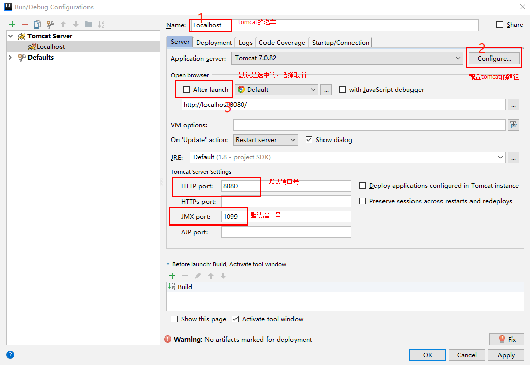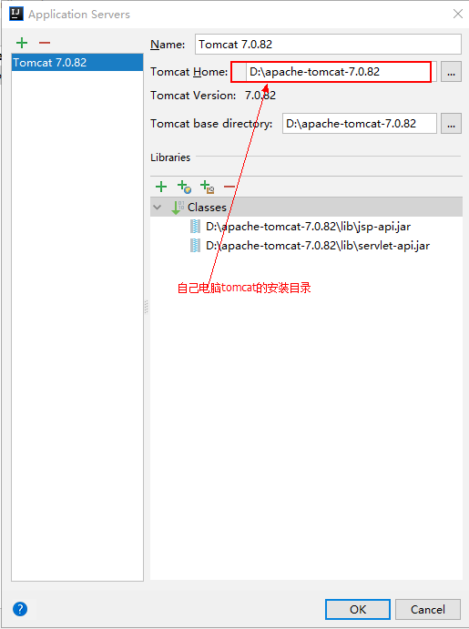 在"Name"处输入新的服务名,点击"Application server"后面的"Configure...",弹出Tomcat Server窗口,选择本地安装的Tomcat目录 -> OK
