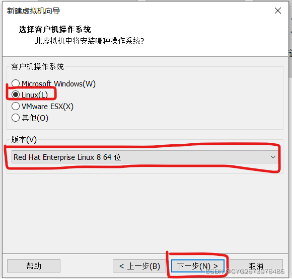 6.选择linux操作系统,版本为Red Hat Enterprise Linux 8 64 位,点击下一步