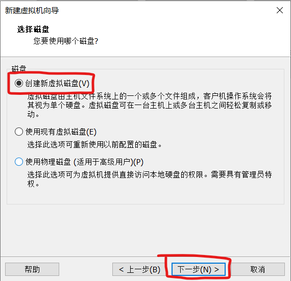 13.选择磁盘,创建新磁盘,如有虚拟磁盘也可以选择第二项,不建议直接使用物理磁盘,点击下一步