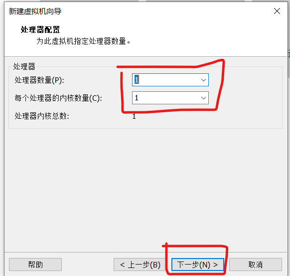 8.选择虚拟机的CPU数量以及CPU核数,完成后点击下一步