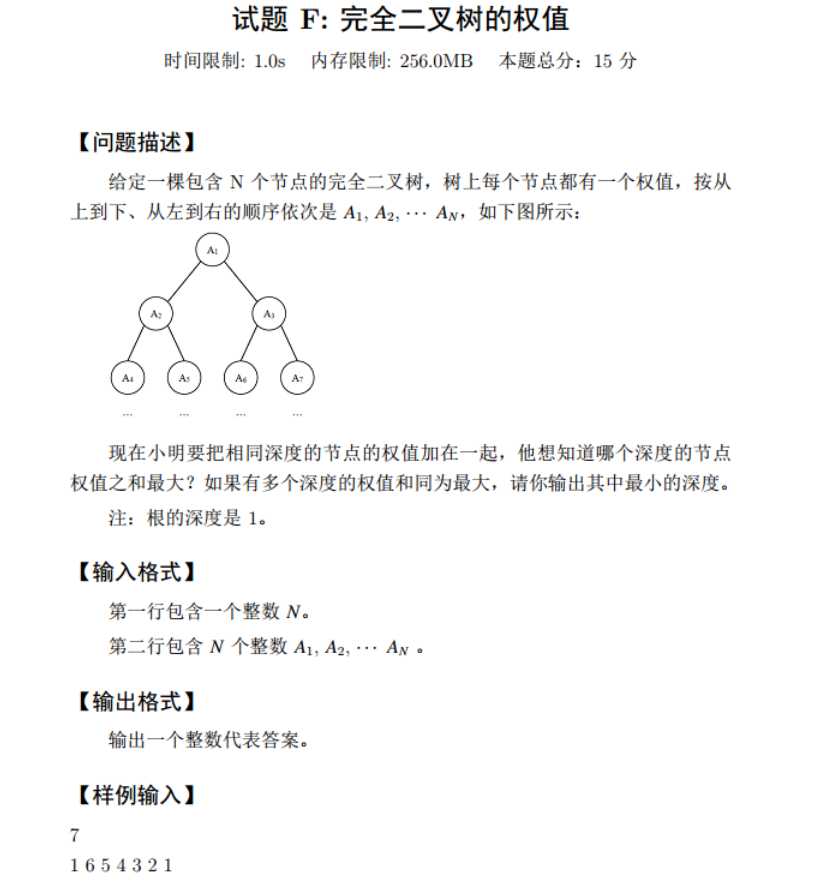 注意:完全二叉树和满二叉树是不一样的,我先把完全二叉树通过补0变成满二叉树然后再进行计算。代码中的depth的根据输入的数N算出的完全二叉树的深度,mm使深度为depth的满二叉树所拥有的节点数。因此对于输入的权重列表(样例输入的第二行的数)需要增加mm-depth个0,才会变成满二叉树