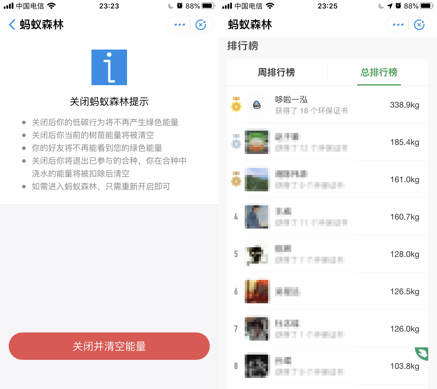 我平时不接触任何游戏,如果一定要找出一个的话,就是蚂蚁森林,我积蓄了338.9kg能量,在当时的好友排行榜中名列榜首,是第二名的两倍。2019年12月25日深夜,我忍痛割爱,至今没有重新入坑。