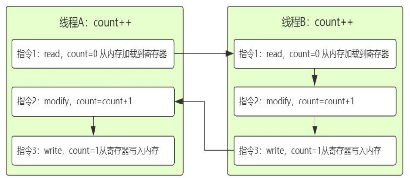 如上图,两个线程 A 和 B 同时执行 count++, 即便 count 使用 volatile 修饰,我们预期的结果值是 2,但实际可能是 1。