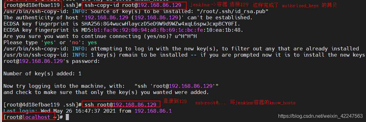 这样 129 jenkin所在服务器的(docker容器)/root/.ssh/konw_hosts 就会追加: