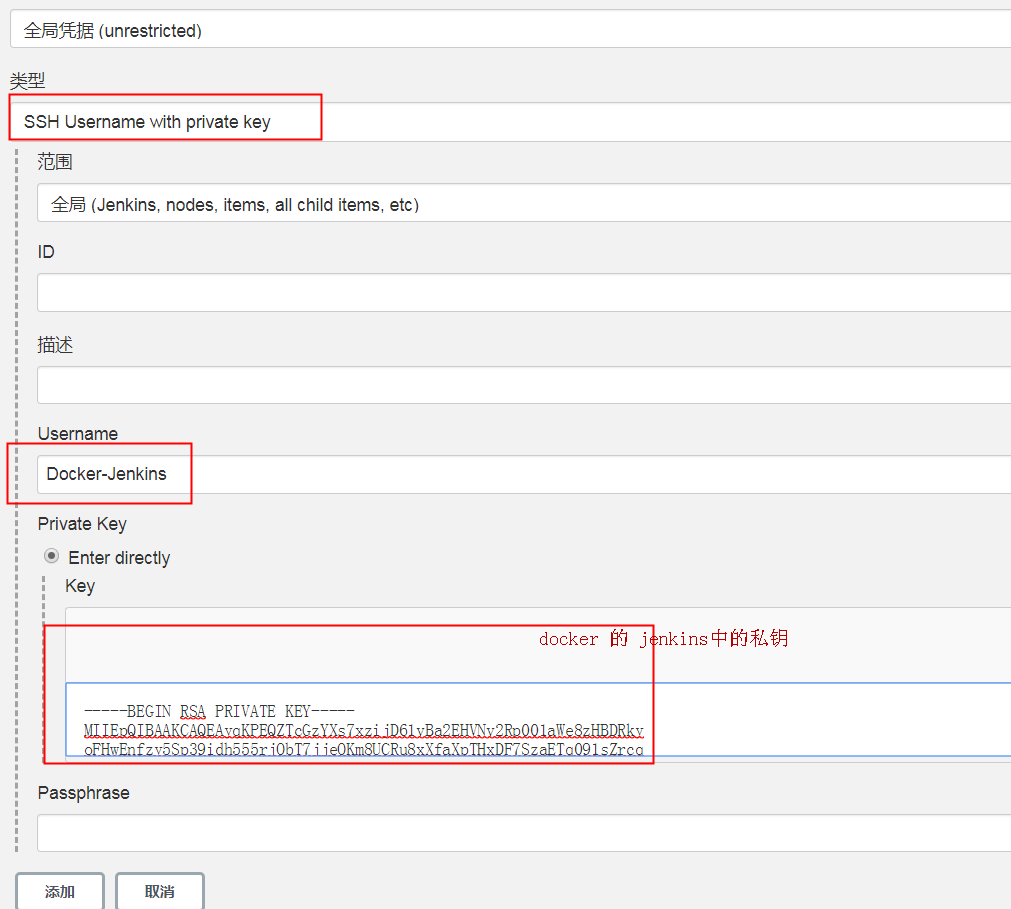点击上图中的添加 –> 凭据: SSH Username with private key