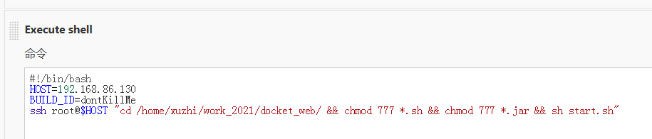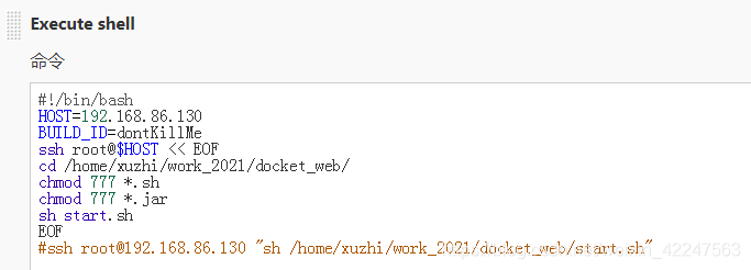 ssh root@$HOST "cd /work/ && chmod 777 *.sh && chmod 777 *.jar && sh start.sh"注:这个是执行在 jenkins所在服务器。