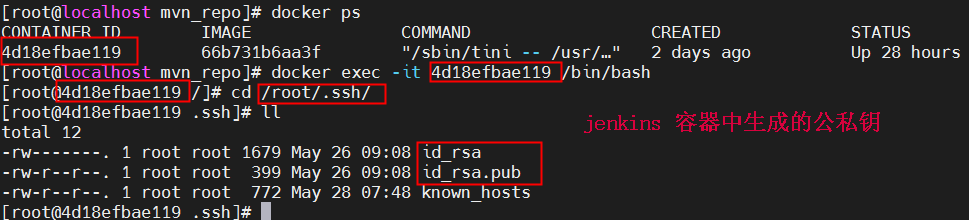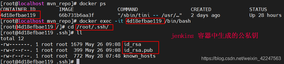 注:(1)docker的jenkins容器需要docker exec –it 4d18efbae119 /bin/bash进入到容器中,cd /root/.ssh/下生成公私钥,以及查看know_hosts等