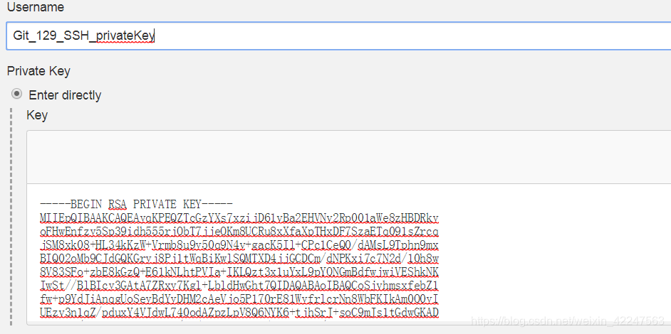 - 通过配置公钥和私钥,将私钥粘贴到这里 需要配置jenkins(容器)服务器中的私钥的位置