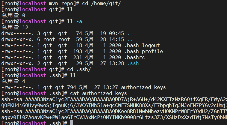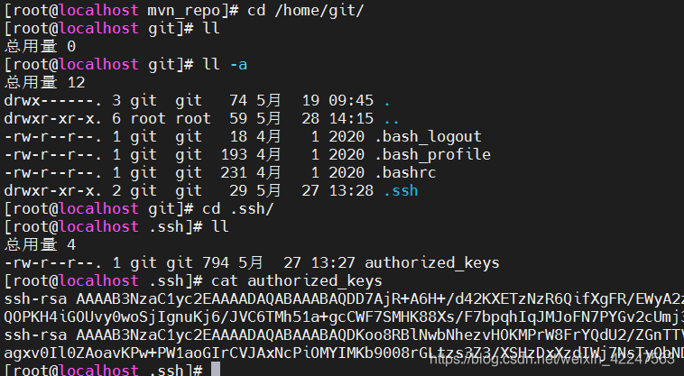 cd /home/git/ - > ll –a -> cd .ssh -> cat authorized_keys -> 粘贴进去即可
