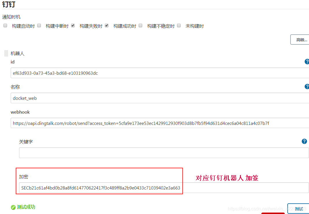 Id 空着 Jenkins会默认生成id ,然后就是 webhook 在钉钉中新增的机器人,