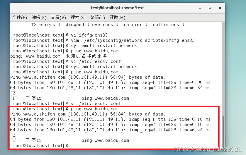 14.测试,输入ping www.baidu.com,看是否能正常上网,此时应该是ping不通的