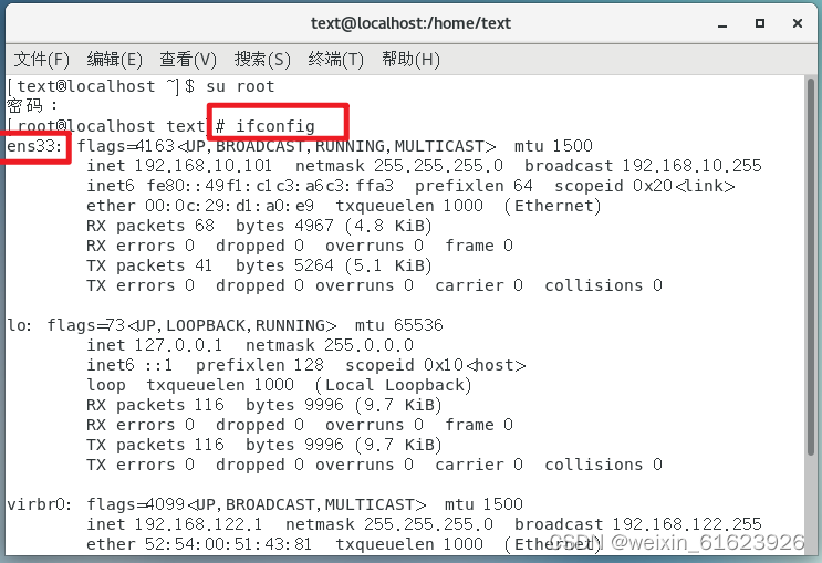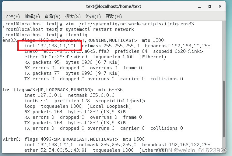 13.输入ifconfig查看IP地址,可以看到现在的IP地址和我们设置的是一样的