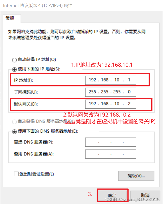 7.将IP地址改为192.168.10.1 ,默认网关改为192.168.10.2(和虚拟机中设置的网关IP一致)