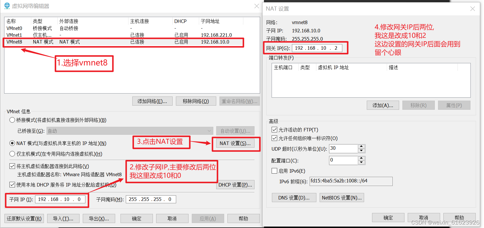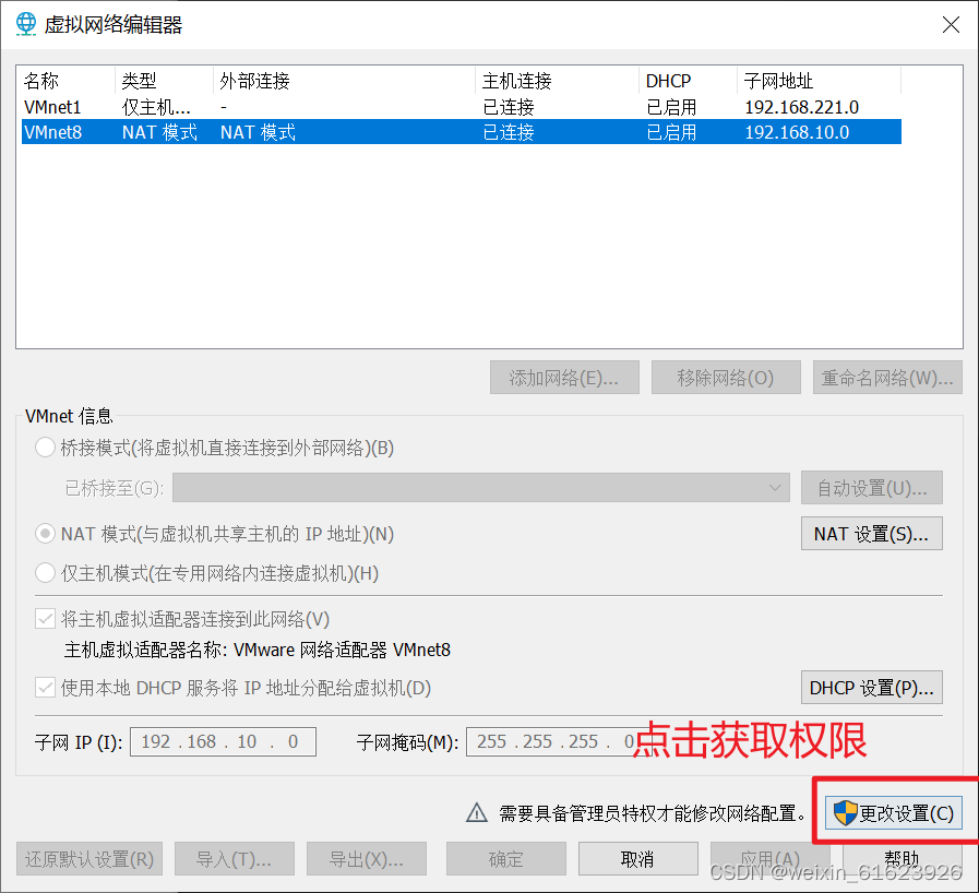 3.选择VMnet8,修改子网IP,改成192.168.10.0,点击NAT设置,修改网关IP,192.168.10.2