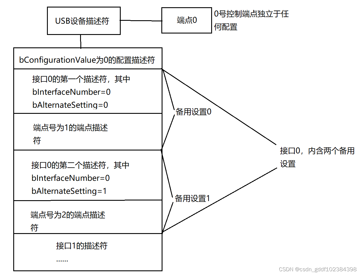如果一个接口具有两个备用设置,则具有两个接口描述符。配置描述符后面是一个接口描述符,其中bInterfaceNumber和bAlternateSetting字段为0,然后是该设置的端点描述符,后跟另一个接口描述符及其关联的端点描述。第二个接口描述符的bInterfaceNumber字段也为0,但第二个接口描述符的bAlternateSetting字段为1。如下图所示: