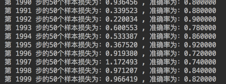 print("第 %d 步的50个样本损失为:%f , 准确率为:%f" % (i, loss_run, acc_run))