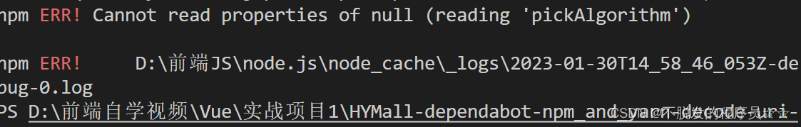 错误一:npm ERR! Cannot read properties of null (reading ‘pickAlgorithm‘)