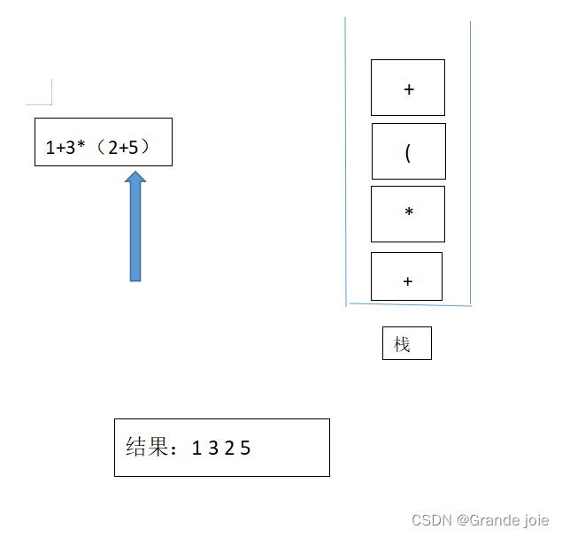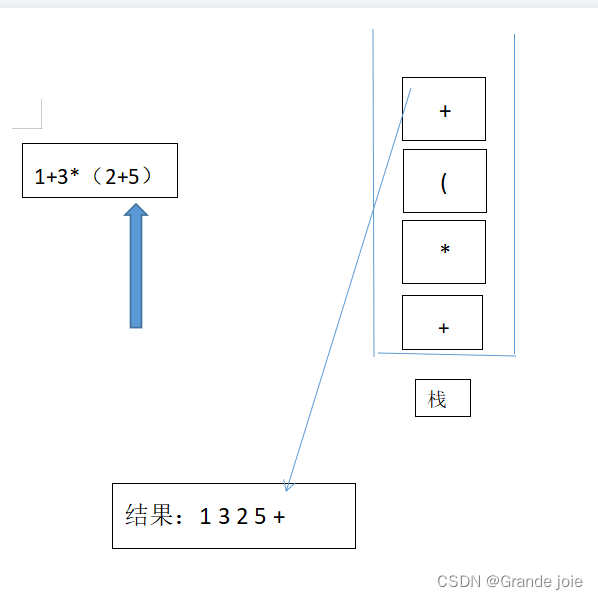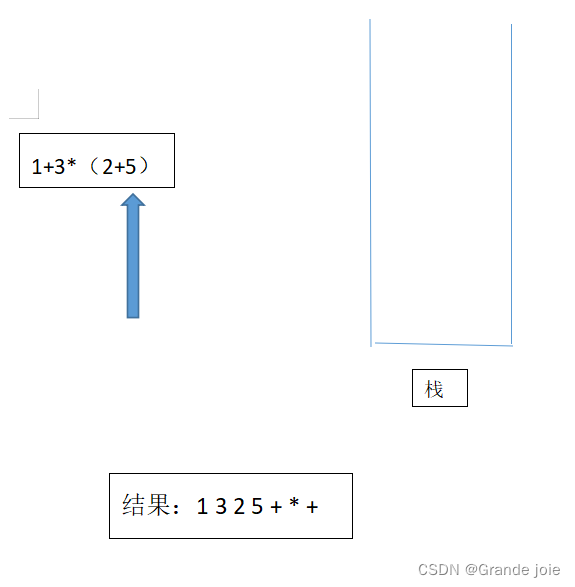 此时的结果“1 3 2 5 + * +”就是我们的中缀表达式 “1+3*(2+5)”转换的后缀的表达式