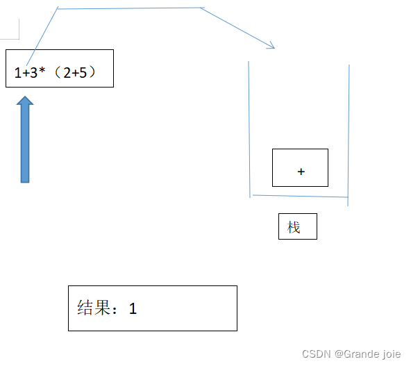 第二步: 第二个读取到的字符是‘+’,为运算符,此时栈中为空,所以直接将‘+’入栈,如图: