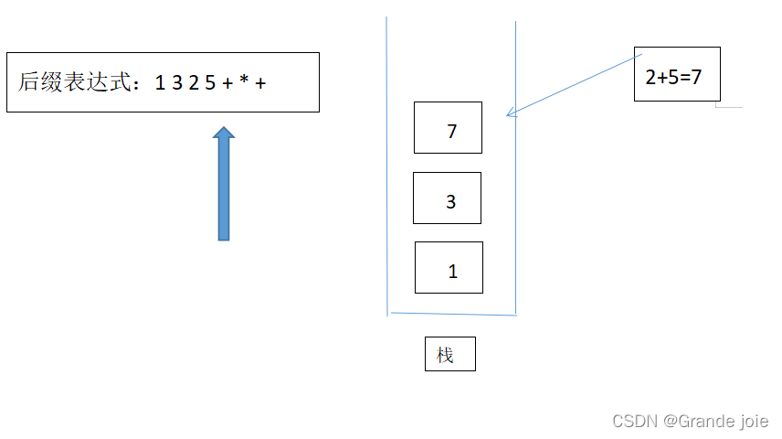 第五步:此时遍历到了‘+’号,所以将栈顶的‘5’弹出作为右操作数,再将‘2’弹出作为左操作数,计算2+5的运算结果为7,再将7压栈,此时栈中数据从栈顶到栈尾依次是为“7 3 1”,如图: