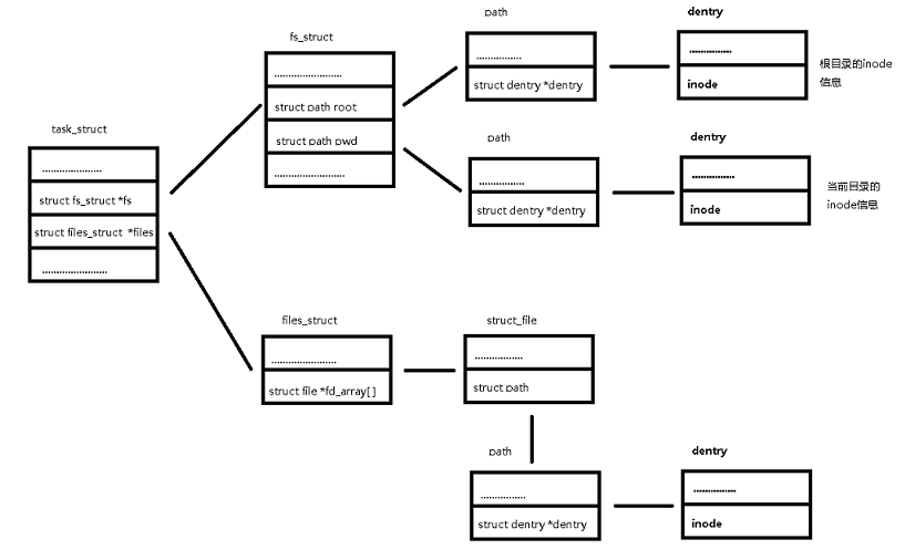 } __attribute__((aligned(4))); /* lest something weird decides that 2 is OK */虽然也有*f_inode但是后面注释告诉我们不是这个。又看到了path,刚刚分析了里面不是也有dentry,dentry里面有inode。再来捋一捋我们的文件系统的逻辑图