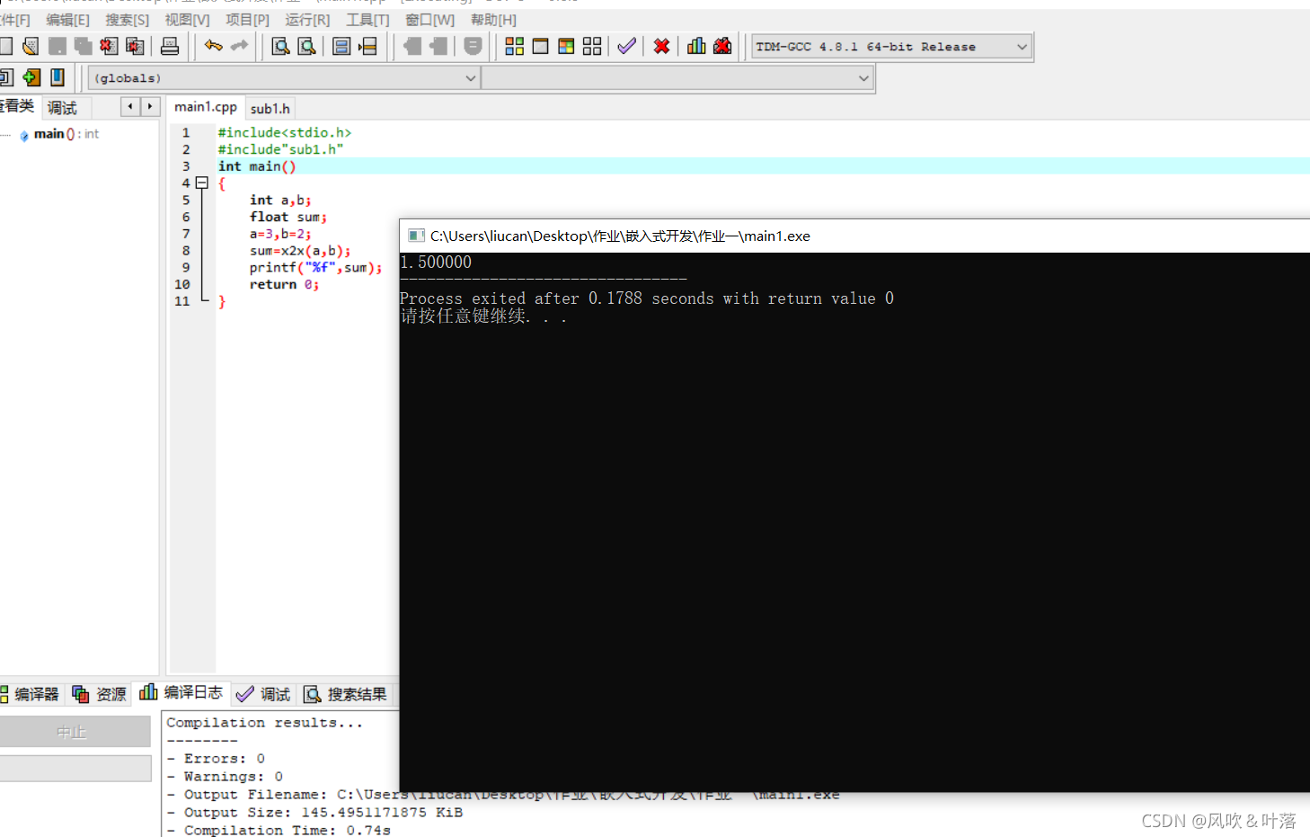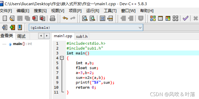 在Dev c++编译环境下,先创建mian1.c头文件,再构建sub1.h文件。