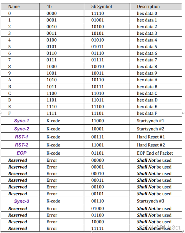 3、讲到这里应该有小伙伴开始对4b5b编解码、BMC编解码很疑惑吧?其实 4b5b是PD通讯规定的数据手段,这样能有效的避免数据在传输时造成传输错误。BMC编解码则是在数据4b5b转换的基础上进行电平的翻转(0不变,1翻转)。那么数据是如何进行4b5b转换呢?USB PD手册中给出了解答,如下图: