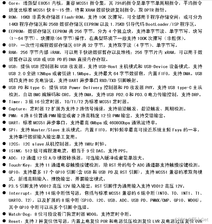 通过上述简易的分析,可以了解USB PD收发消息的基本概念,能得出PD通讯是需要基于一些硬性条件,比如:需要4b5b编解码、BMC发送、消息校验等。至于博主为什么会在众多单片机产品中选择CH543而不是其它单片机呢?是因为 CH543内置了USB PD收发器PHY和USB Power Delivery控制器,另外PD通讯时是可以自动BMC编解码、4B5B编解码、CRC校验。这样一来不仅能大量的节约代码空间,还能减轻工程带来的难度(嘿嘿,因为不用进行4B5B转码,不用CRC校验,也不用编写前导包。这些都好折磨人,现在可就轻松了不少)。