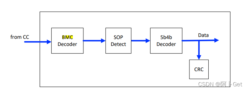 至于接收消息刚好和发送消息反过来,当检测到CC上有消息到来时,物理层会通过BMC进行接收,然后检查SOP类型,最后进行4b5b解码,将会得到数据Data和CRC校验码。如下图: