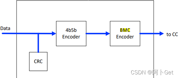 先来说下如何发送消息,首先将数据Data和校验码CRC进行4b5b编码后通过BMC发送到CC线上,这就完成PD消息的发送,是不是很简单,也没那么神秘吧!如下图: