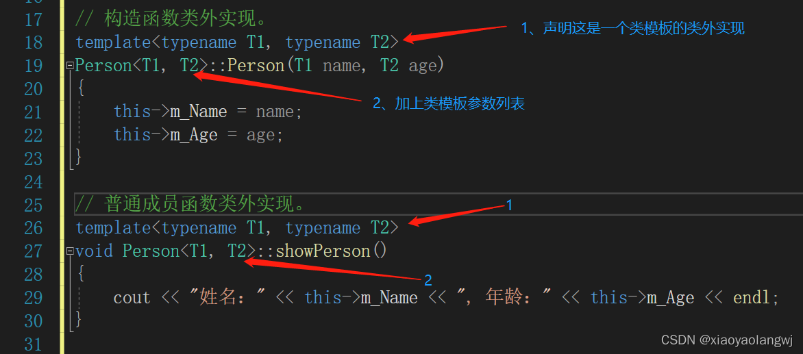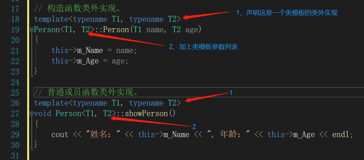 总结:类模板的成员函数类外实现时,需要加上类模板参数列表。