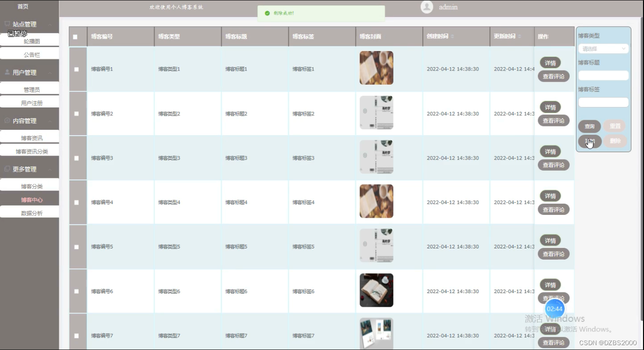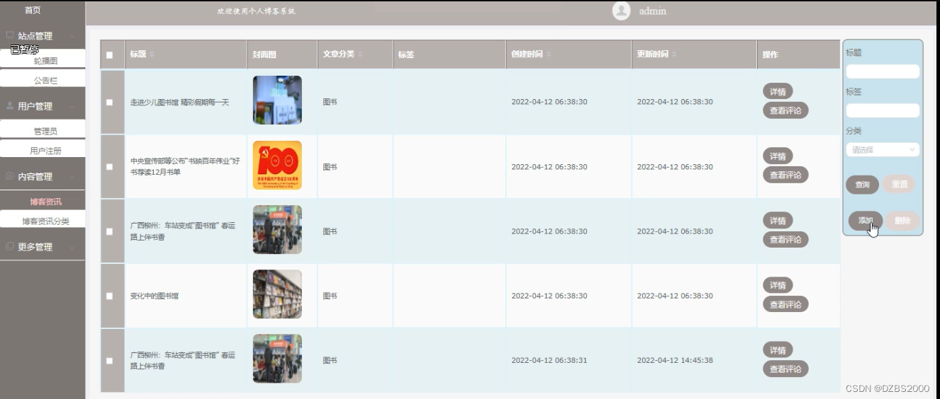 (2)博客资讯管理:管理员在后台可以对个人博客系统 中显示的博客资讯进行增删改查。