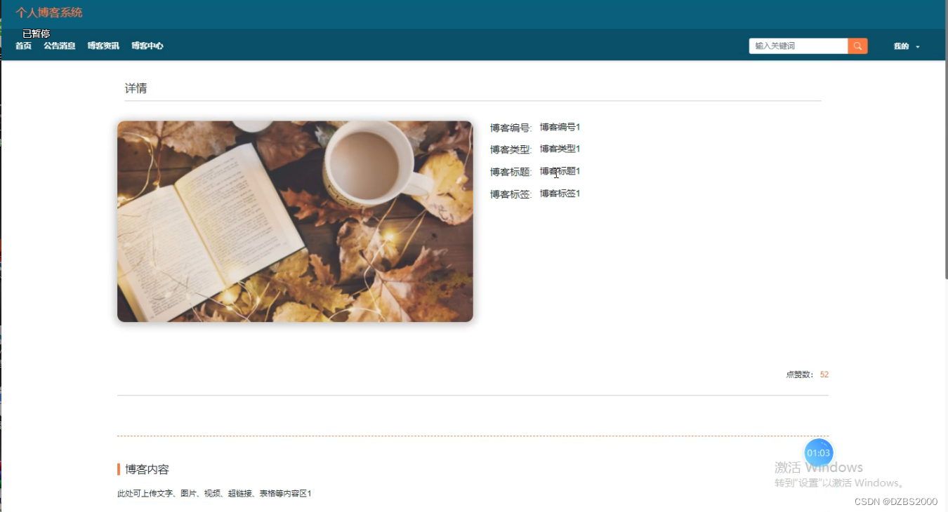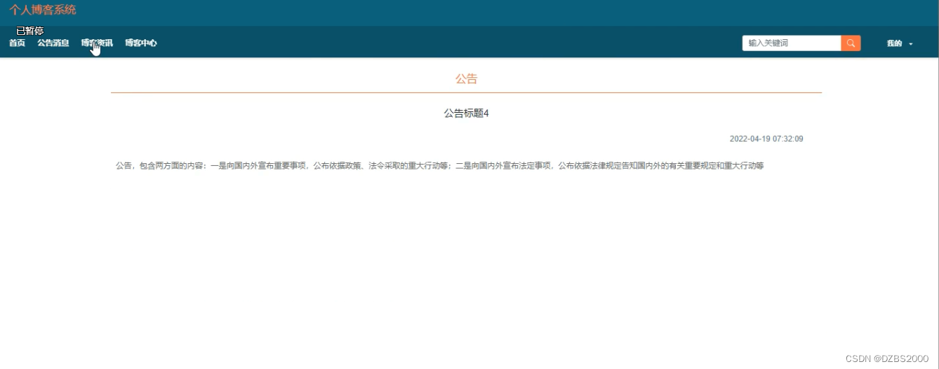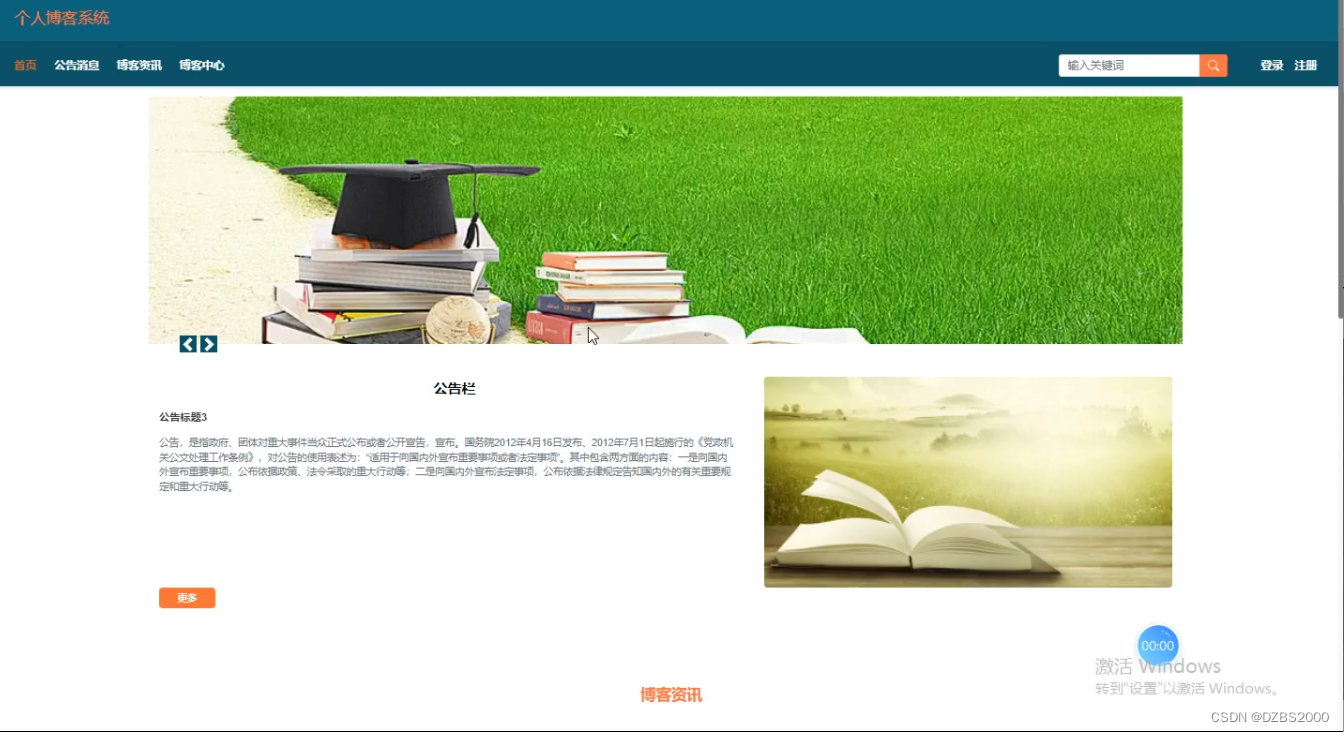 (2)查看个人博客系统 的首页信息:个人博客系统 的首页信息包含了首页、公告消息、博客资讯、博客中心、我的等。