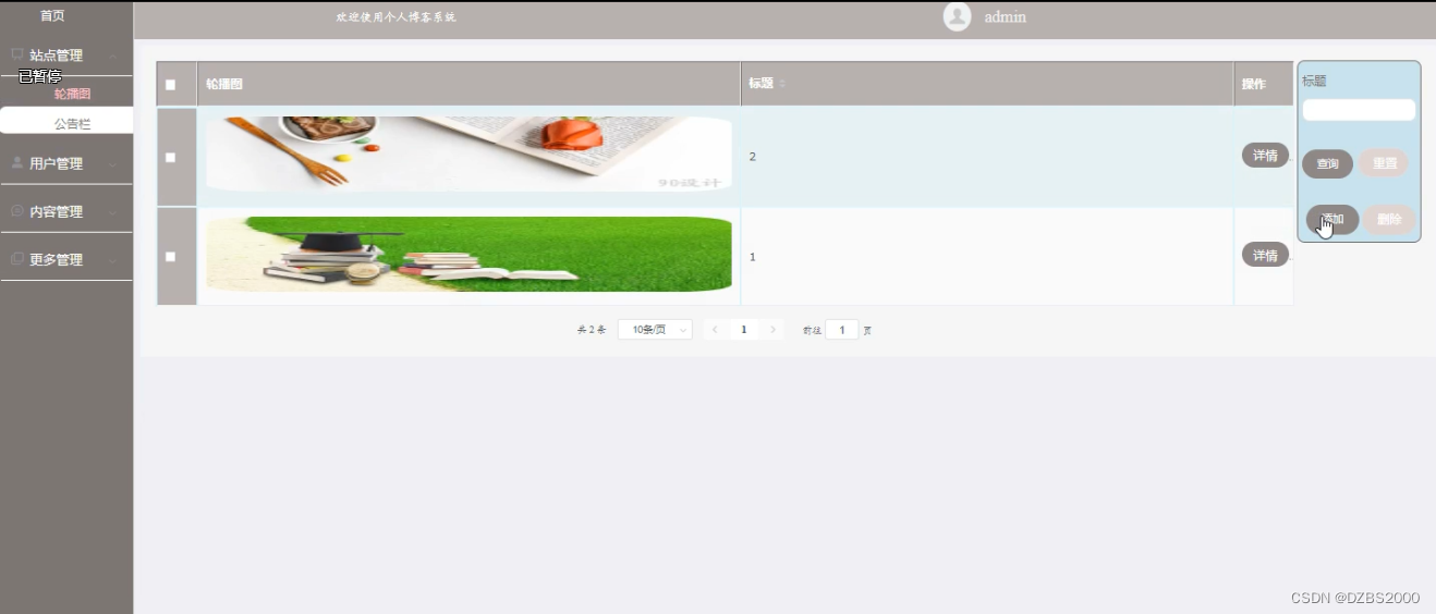 (5)站点内容管理:管理员可以对个人博客系统中首页显示的轮播图以及系统中的一些公告发布到系统当中,让用户及时的查看到系统信息,进行合理安排。