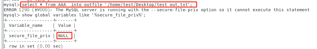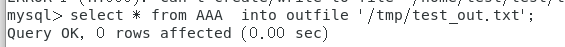 执行命令select * from AAA into outfile '/home/test/Desktop/test_out.txt';时,报错如下: