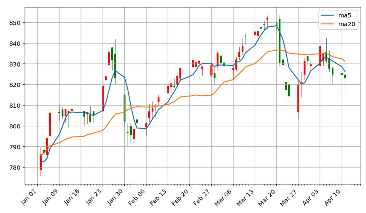 数据中只有每天的价格和成交量,所以我们需要自己算出5日均价和10日均价,并将均价的折线图(也称移动平均线)与K线图画在一起。