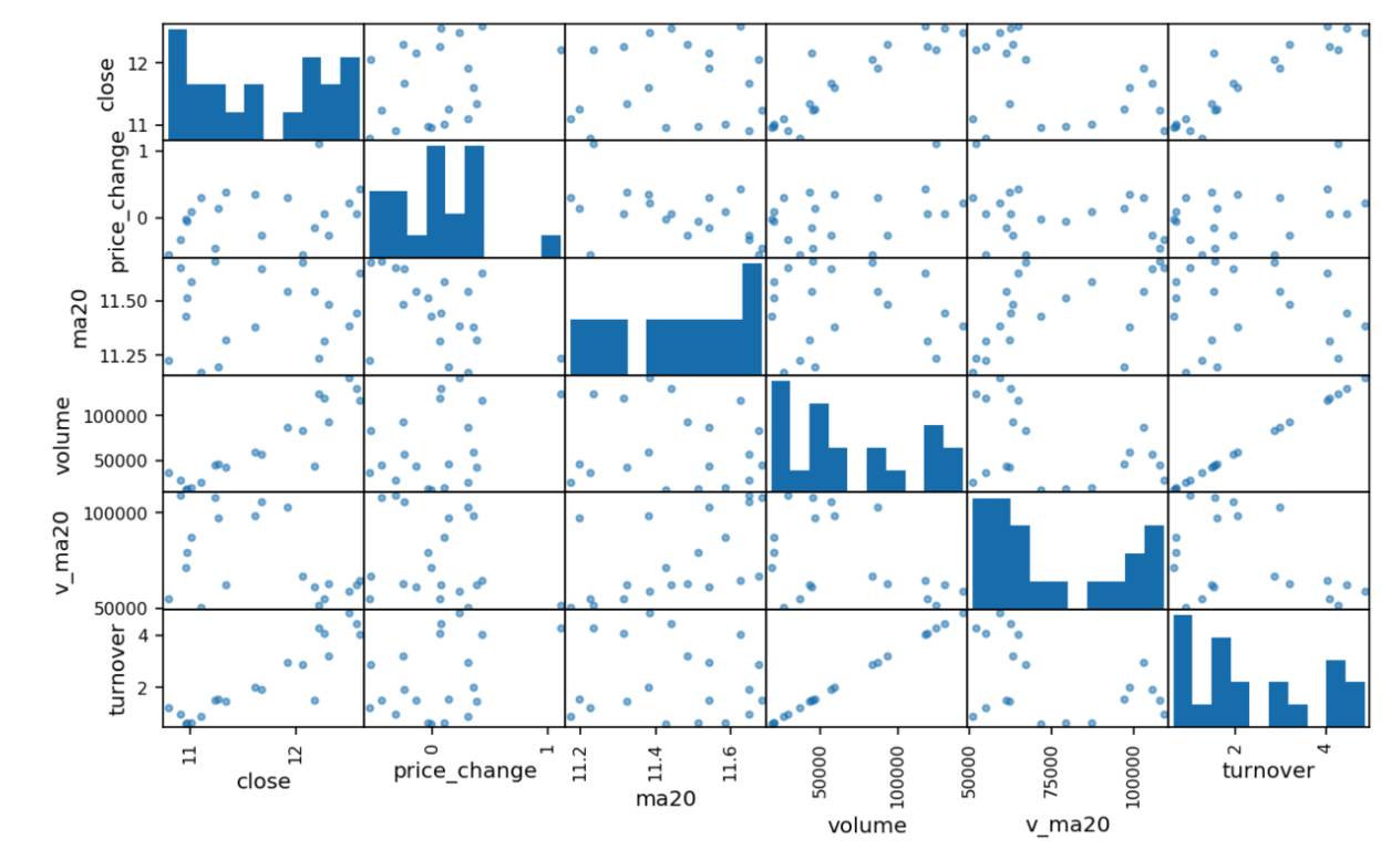 在观察了价格的走势之后,我们来看看各指标之间的关系。下面挑选了部分代表性的指标,并使用pandas.scatter_matrix()函数,将各项指标数据两两关联做散点图,对角线是每个指标数据的直方图。