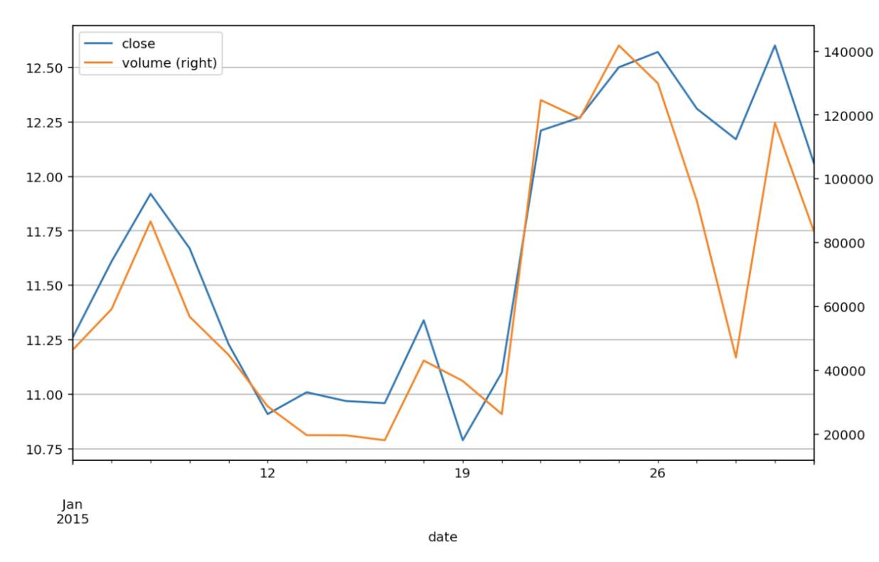 以上我们用矩阵图表的方式在多个指标中迅速找到了强相关的指标。接着做出收盘价和成交量的折线图,因为它们的数值差异很大,所以我们采用两套纵坐标体系来做图。