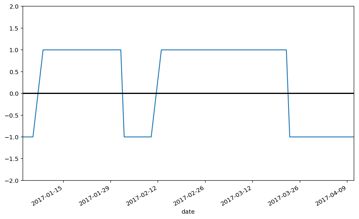 为了找出交易的时机,我们计算5日均价和20日均价的差值,并取其正负号,作于下图。当图中水平线出现跳跃的时候就是交易时机。
